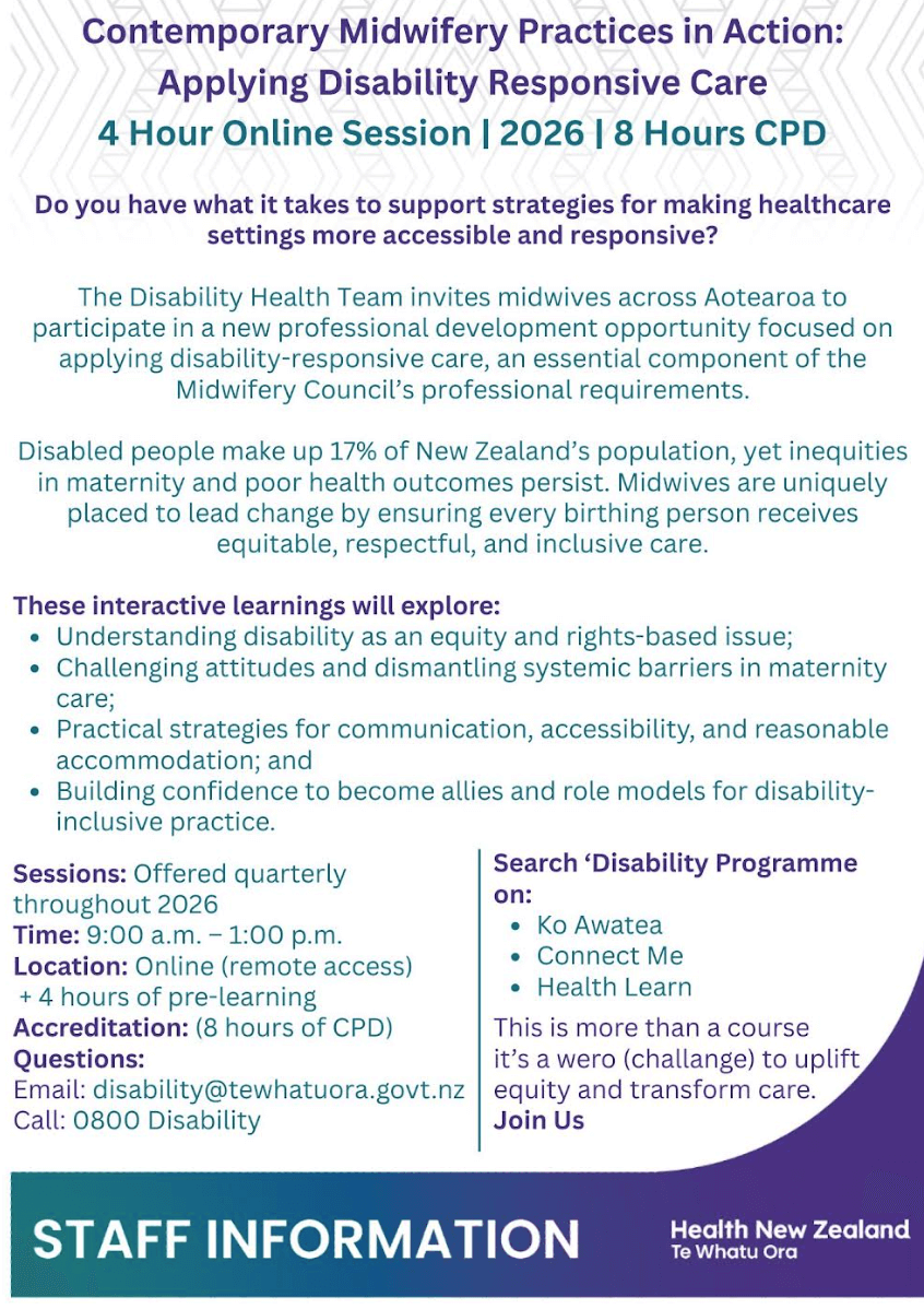 The Disability Health Team invites midwives across Aotearoa to join a new professional development opportunity focused on Applying Disability Equity, an essential component of the Midwifery Council?s professional requirements.