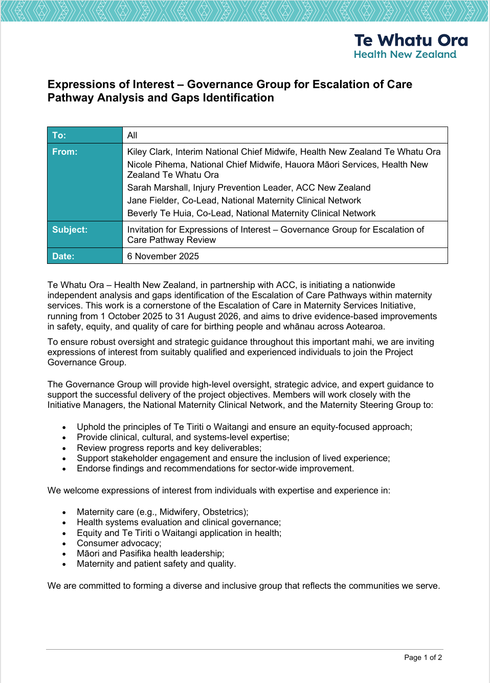 Please note that Expressions of Interest are to be submitted to NationalMaternitynetwork@TeWhatuOra.govt.nz by COB Thursday, 27 November 2025. We have extended the deadline to ensure broad participation and provide equal opportunity for all interested parties to prepare comprehensive submissions.