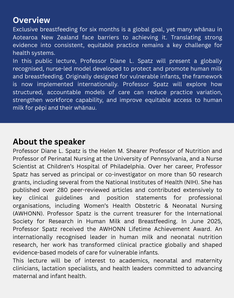 Massey University is hosting this public lecuture, ?From evidence to impact: protecting human milk and breastfeeding for every p?pi and wh?nau?.