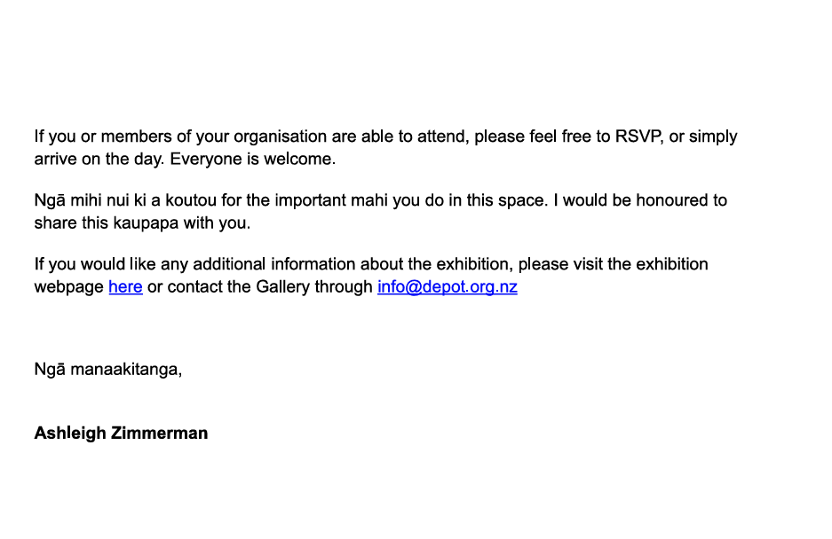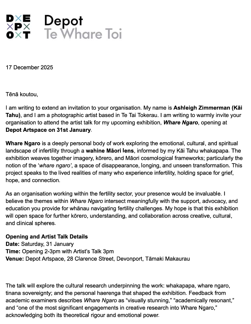 My name is Ashleigh Zimmerman (K?i Tahu), and I am a photographic artist based in Te Tai Tokerau. I am writing to warmly invite you and members of your organisation to the opening and artist talk for my upcoming exhibition, Whare Ngaro, at Depot Artspace.
