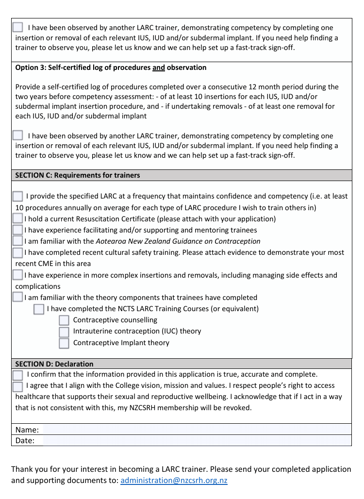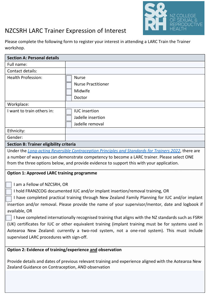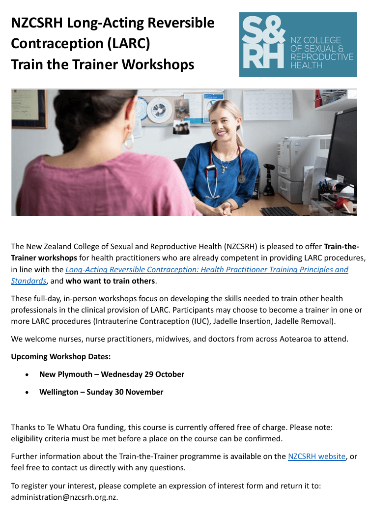 The next round of NZCSRH LARC TTT workshops are open. An important, and exciting update to note, the LARC TTT course is now being offered free to all health professionals who meet the training criteria.