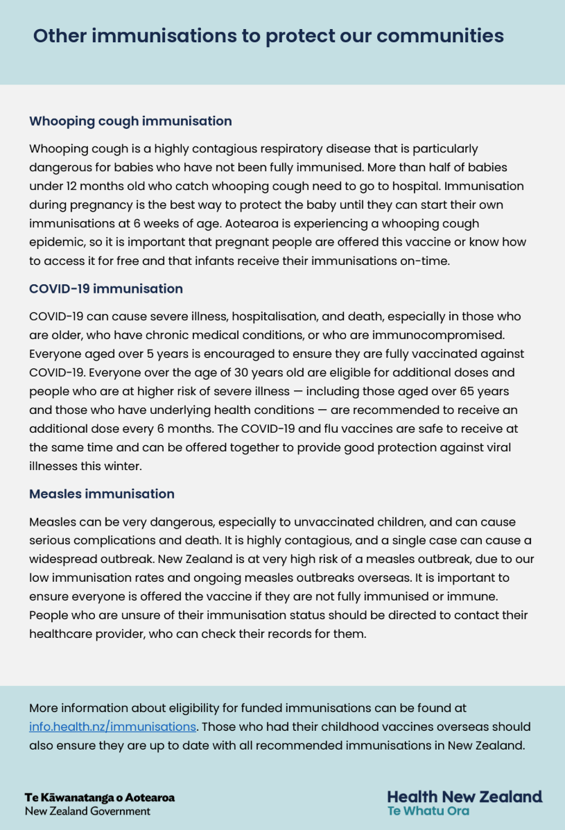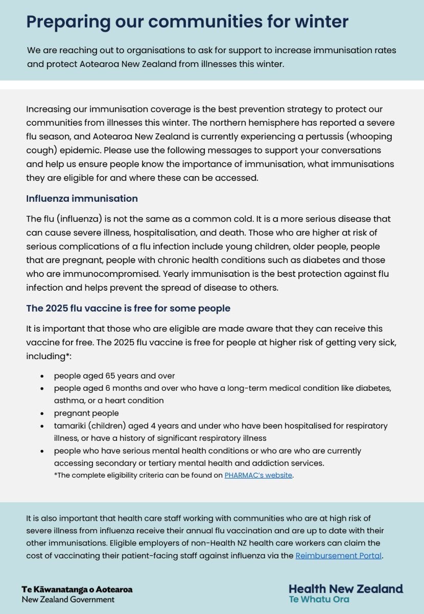 We are reaching out to our health sector partners to ask for your support to increase our immunisation rates and to protect Aotearoa New Zealand from influenza and other vaccine-preventable illnesses this winter.